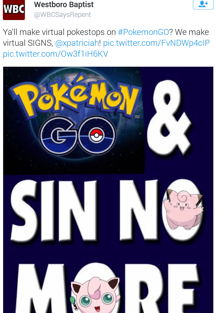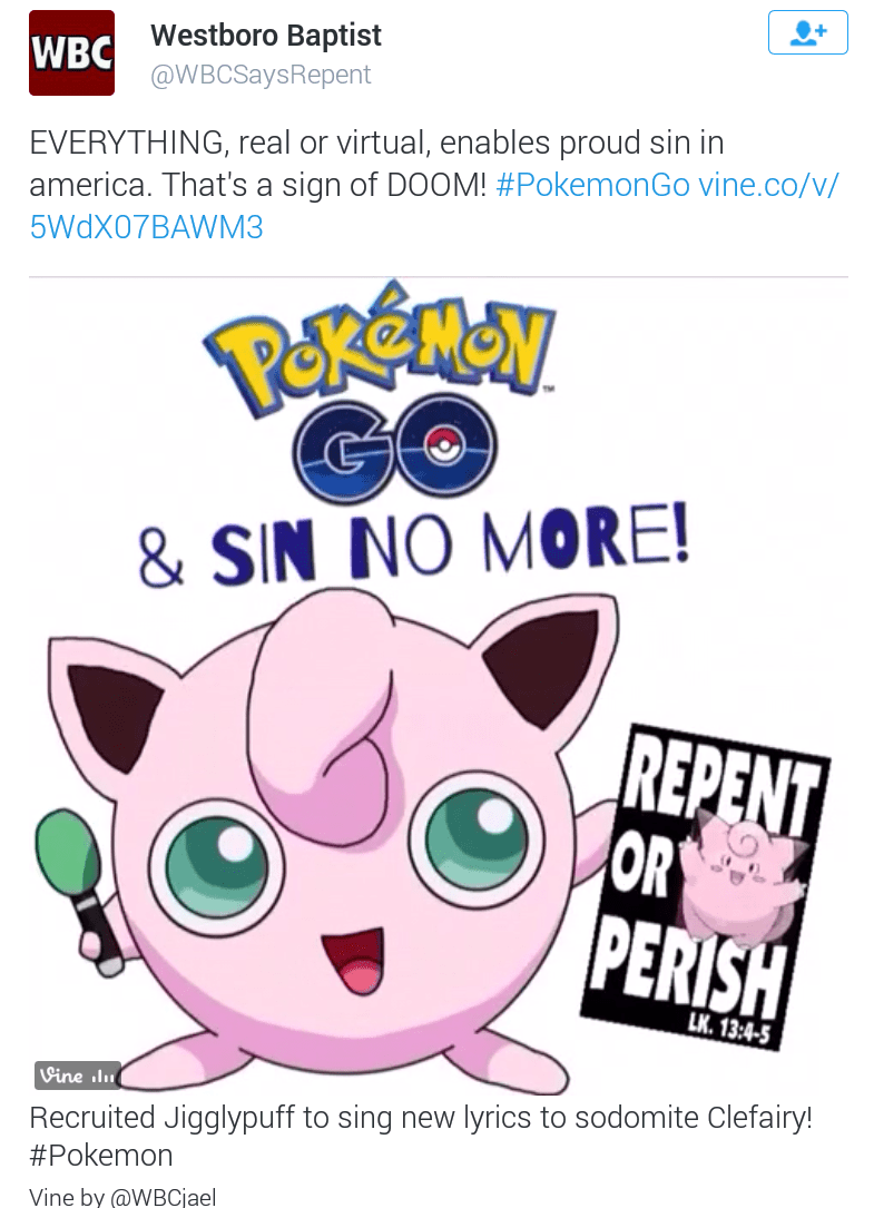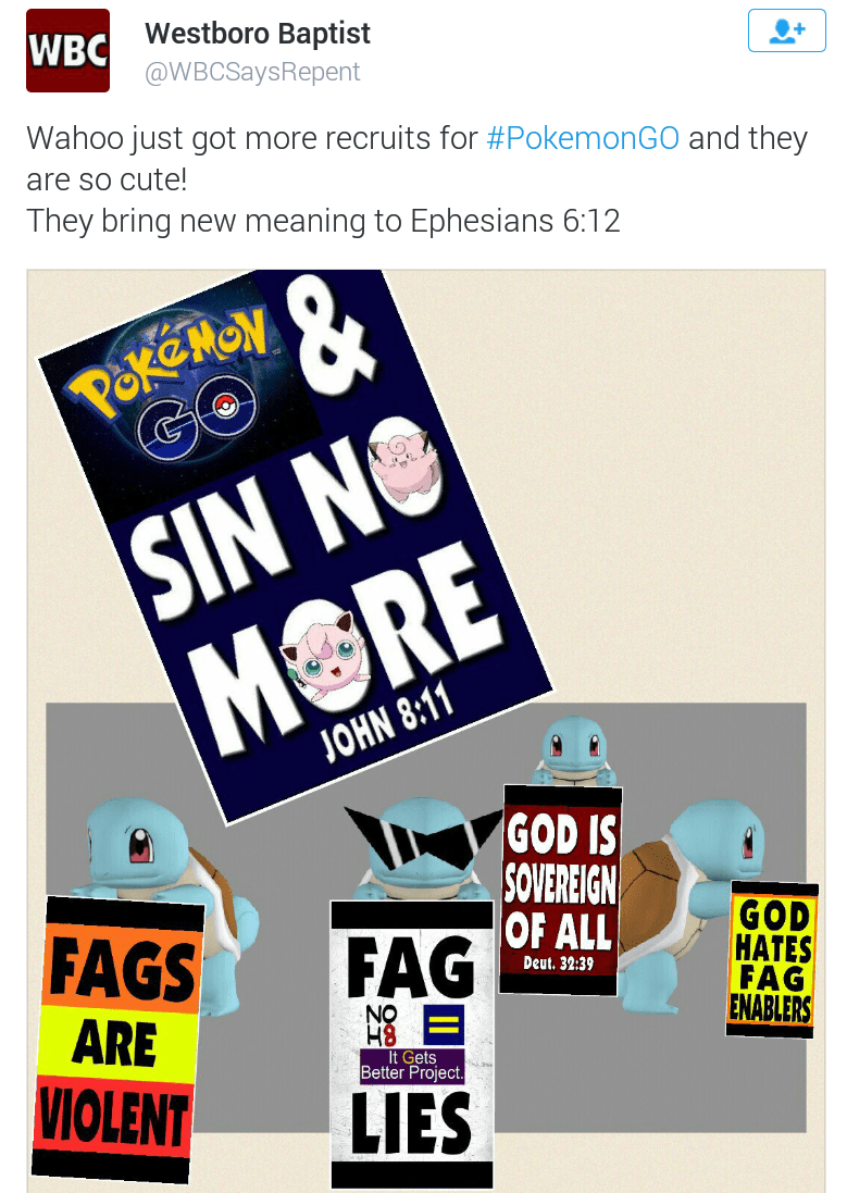Infamous church (though they are more large scale fsmily) West Boro Church have created several memes and a music video using pokemon imagery to spread their angry message of homophobia.