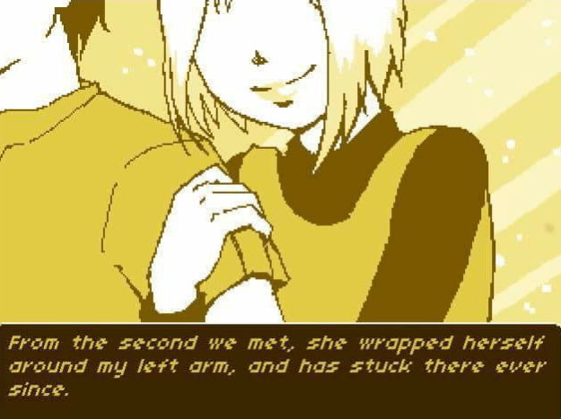 That is skillful allusion that the game player wouldn’t get until the end of the game. You are being presented with a serious and personal topic in a manner that is familiar and common. You are being told she can be clingy but it is actually him fighting the urge to not harm himself for long periods of time. You are being told she tries to force her embrace but it is actually him dealing with something that he has faced since high school. Her urging the character to stay home all day with her is the character indeed contemplating to once again cut and forget the outside world.