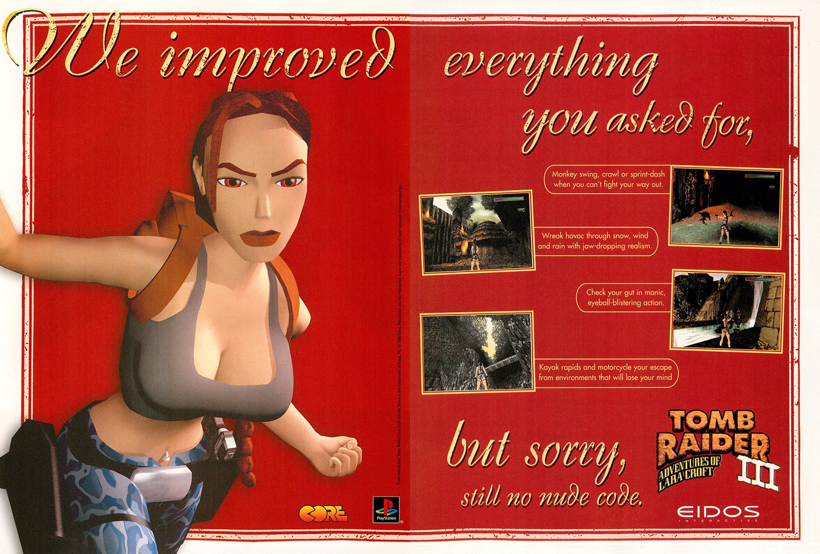 I won’t say that edgy marketing first started in the 90s, as it is a tactic as old as advertising itself. As a 90s kid, I will say that it was the era that I was the target of these ads, and man… they could get out of hand. From the original Tomb Raider series making it clear that the game was not for kids with raunchy ads reminding you that Lara Croft has breasts, to every vaguely violent game wanting me to know just how much the adults in my life didn’t want me playing it. Sometimes I look back at that time, and alongside the deep cringe, I think of how whimsically try hard it was as well.