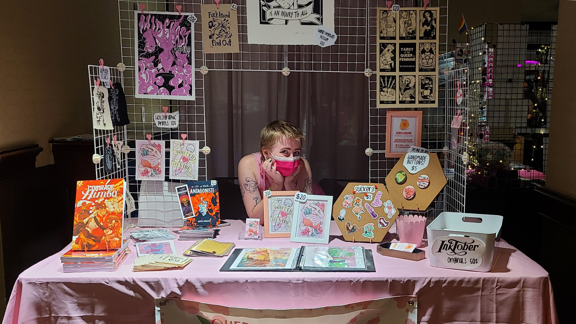 Their style is fun, spirited, and beautifully captivating. The pieces I saw at the convention reminded me of the zines I read back in my college days, perfectly pairing with their progressive pieces and wilder collectibles. They offer prints, patches, stickers, and comics, and is the creator of a thrilling Webtoons series: The Lives and Deaths of an Antagoniste!